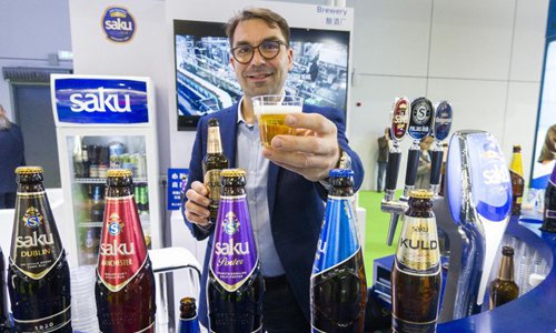 A staff member shows a cup of beer from Estonia at Food and Agricultural Products exhibition area during the second China International Import Expo in Shanghai, east China, Nov. 7, 2019. (Xinhua/Cai Yang)