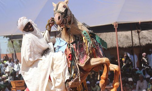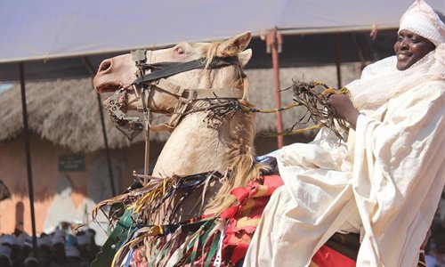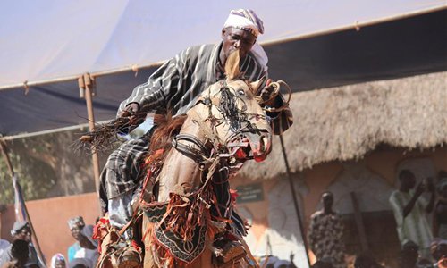 A man performs horse show during the Gaani Festival in Nikki, Benin, Nov. 9, 2019. The two-day festival features traditional tribal dances and equestrian shows. It is the most important festival of the Bariba people of Benin and is designed to celebrate victory and joy. (Photo by Seraphin Zounyekpe/Xinhua)