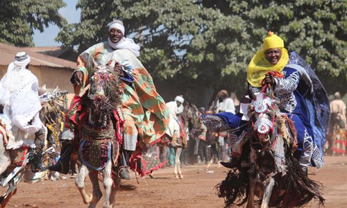 People perform horse show during the Gaani Festival in Nikki, Benin, Nov. 9, 2019. The two-day festival features traditional tribal dances and equestrian shows. It is the most important festival of the Bariba people of Benin and is designed to celebrate victory and joy. (Photo by Seraphin Zounyekpe/Xinhua)