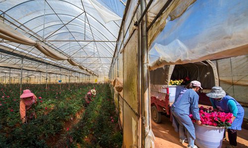 Flower growers work at a flower industrial park in Yi autonomous county of Shilin, southwest China's Yunnan Province, Feb. 15, 2019. (Xinhua/Hu Chao)