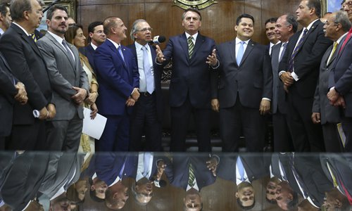 Brazilian President Jair Bolsonaro (center) speaks during the delivery of the economic reform package to the National Congress in Brasilia on Tuesday. The government unveiled a bundle of wide-ranging reforms, aimed at cutting spending and reducing the size of the state to drive down its chronic fiscal deficit. Photo: AFP
