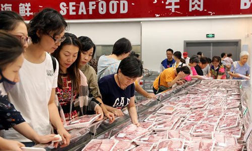 Customers buy fresh pork in a Costco warehouse store in Minhang District, east China's Shanghai, Sept. 19, 2019. U.S. retail giant Costco Wholesale openend its first brick-and-mortar store on the Chinese mainland in late August. The store has been running for three weeks and customer passions remain unabated, with short-time queuing still required to enter the store. (Xinhua/Liu Ying)