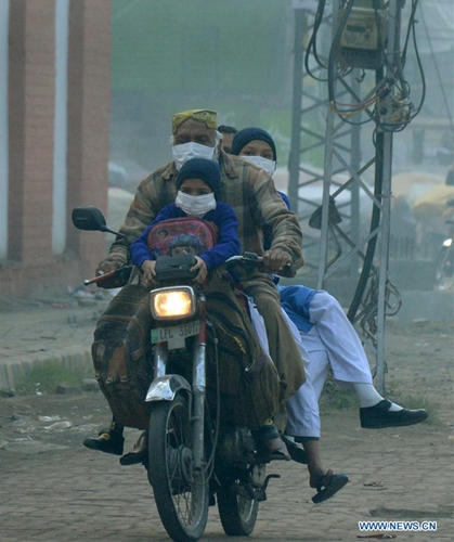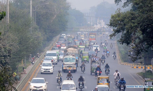 Commuters are seen amid heavy smog in Lahore, eastern Pakistan, on Nov. 15, 2019. The air quality in Lahore and adjoining districts on Friday surpassed a hazardous level, forcing local government to close down all public and private schools for two days, according to a notification issued by the Punjab School Education Department. (Photo by Sajjad/Xinhua)