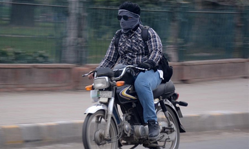 A man with his face covered rides a motorbike amid heavy smog in Lahore, eastern Pakistan, on Nov. 15, 2019. The air quality in Lahore and adjoining districts on Friday surpassed a hazardous level, forcing local government to close down all public and private schools for two days, according to a notification issued by the Punjab School Education Department. (Photo by Sajjad/Xinhua)