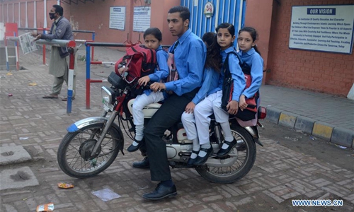 A man takes students leaving their school which was closed down due to heavy air pollution in Lahore, eastern Pakistan, on Nov. 15, 2019. The air quality in Lahore and adjoining districts on Friday surpassed a hazardous level, forcing local government to close down all public and private schools for two days, according to a notification issued by the Punjab School Education Department. (Photo by Sajjad/Xinhua)