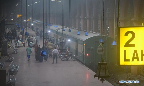 Passengers wait at a railway station amid heavy smog in Lahore, eastern Pakistan, on Nov. 15, 2019. The air quality in Lahore and adjoining districts on Friday surpassed a hazardous level, forcing local government to close down all public and private schools for two days, according to a notification issued by the Punjab School Education Department. (Photo by Sajjad/Xinhua)