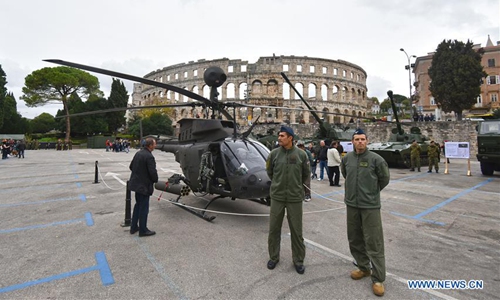 A military helicopter is displayed on the occassion of the inauguration ceremony of barrack "Croatian defenders of Istria" in Pula, Croatia, Nov. 15, 2019. About 140 members of the Croatian Armed Forces are deployed in the barrack. (Dusko Marusic/Pixsell via Xinhua)