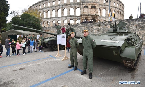 Military vehicles are displayed on the occassion of the inauguration ceremony of barrack "Croatian defenders of Istria" in Pula, Croatia, Nov. 15, 2019. About 140 members of the Croatian Armed Forces are deployed in the barrack. (Dusko Marusic/Pixsell via Xinhua)