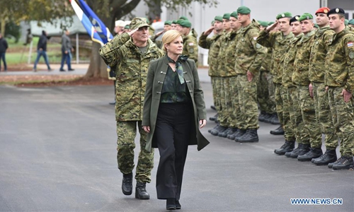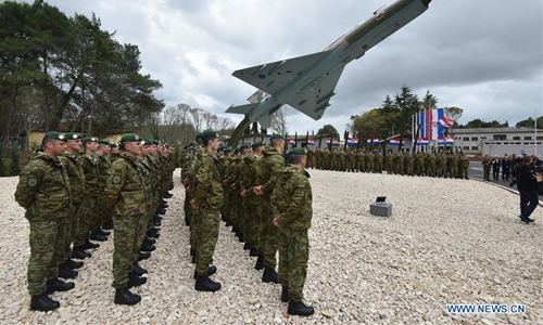 Croatian soldiers take part in the inauguration ceremony of barrack "Croatian defenders of Istria" in Pula, Croatia, Nov. 15, 2019. About 140 members of the Croatian Armed Forces are deployed in the barrack. (Dusko Marusic/Pixsell via Xinhua)