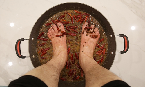 A massage parlor in Yuzhong district, Southwest China's Chongqing Municipality is offering clients a hot pot package, that includes bathing customers' feet in a tub of chilli pepper soup. A customer enjoys the hot pot foot treatment on Saturday. Photo: VCG