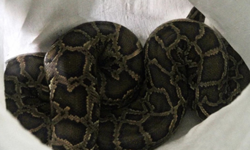 A 20-kilogram, 3-meter-long boa constrictor gave a local restaurant owner in Foshan of South China's Guangdong Province a creepy surprise when the snake fell from the ceiling, ending a ten-year mystery.