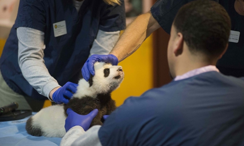 Inset: Zoo staff examine 2-month old Bei Bei Photo: IC