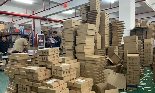 Boxes to be used for packaging pile up at a sports manufacturer in Yiwu, East China's Zhejiang Province on Tuesday. Photo: Ma Jingjing/GT