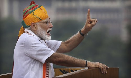 Indian Prime Minister Narendra Modi addresses to the nation on the country's Independence Day from the ramparts of the historical Red Fort in New Delhi, India, August 15, 2019. Photo: IC
