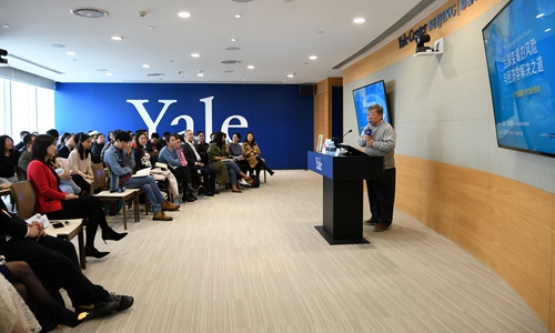 Economist Liang Xiaomin shares his view on William Nordhaus' book The Climate Casino at the Yale Center Beijing. Photo: Courtesy of Yale Center Beijing