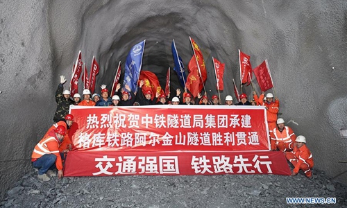 Staff members celebrate the completion of Altun Mountains Tunnel on the Golmud-Korla railway line, connecting Golmud in Qinghai Province and Korla in Xinjiang Uygur Autonomous Region, on Nov. 19, 2019. After three and half years of construction work, the Altun Mountains Tunnel was dug through Tuesday. (Xinhua/Song Yanhua)
