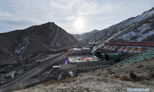 Photo taken on Nov. 19, 2019 shows the Altun Mountains Tunnel on the Golmud-Korla railway line, connecting Golmud in Qinghai Province and Korla in Xinjiang Uygur Autonomous Region, on Nov. 19, 2019. After three and half years of construction work, the Altun Mountains Tunnel was dug through Tuesday. (Xinhua/Song Yanhua)