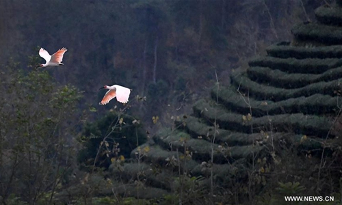 Photo taken on Nov. 19, 2019 shows crested ibises flying over the Muma river, a branch of the Hanjiang river, in northwest China's Shaanxi Province. Crested ibises, with their iconic red crests and black long beaks, were thought to be extinct in China until seven wild birds were observed in Shaanxi Province in 1981, a discovery that prompted captive breeding and enhanced protection of the species. (Xinhua/Tao Ming)