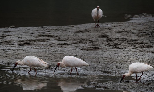 Photo taken on Nov. 19, 2019 shows crested ibises feeding by the Muma river, a branch of the Hanjiang river, in northwest China's Shaanxi Province. Crested ibises, with their iconic red crests and black long beaks, were thought to be extinct in China until seven wild birds were observed in Shaanxi Province in 1981, a discovery that prompted captive breeding and enhanced protection of the species. (Xinhua/Tao Ming)