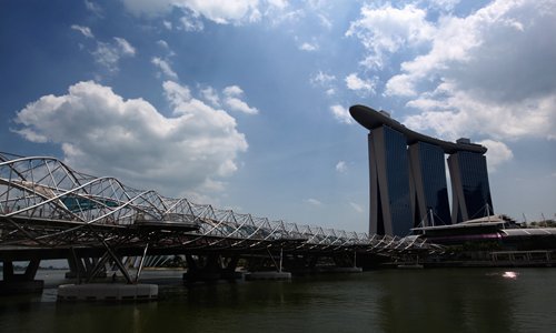 A view of the Helix Bridge and the Marina Bay Sands hotel in Singapore Photo: VCG