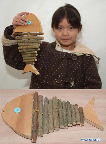Combo photo shows third grader Peng Yiran displaying a "fish" made by herself with branches (top) and her works of "fish" (bottom) at Xuqiao Primary School in Xuxing Village of Tianxin District in Changsha, central China's Hunan Province, Nov. 20, 2019. The school in this year started to teach students to make handicrafts at art lessons by using natural materials such as tree branch and pine cone to help them discover the nature. (Xinhua/Chen Zhenhai)