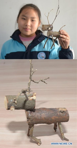 Combo photo shows fourth grader Tan Shiyu displaying an "elk" made by herself with branches (top) and her works of "elk" (bottom) at Xuqiao Primary School in Xuxing Village of Tianxin District in Changsha, central China's Hunan Province, Nov. 20, 2019. The school in this year started to teach students to make handicrafts at art lessons by using natural materials such as tree branch and pine cone to help them discover the nature. (Xinhua/Chen Zhenhai)