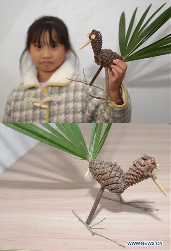 Combo photo shows fourth grader Tang Kewei displaying an "ostrich" made by herself with pine cones and branches (left) and her works of "ostrich" (right) at Xuqiao Primary School in Xuxing Village of Tianxin District in Changsha, central China's Hunan Province, Nov. 20, 2019. The school in this year started to teach students to make handicrafts at art lessons by using natural materials such as tree branch and pine cone to help them discover the nature. (Xinhua/Chen Zhenhai)