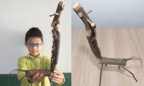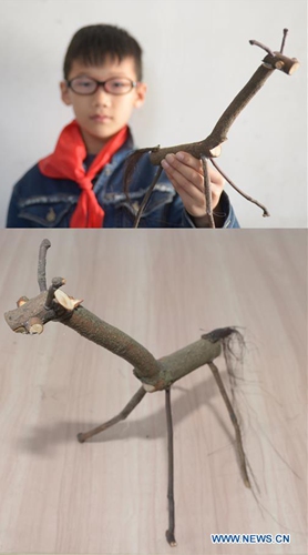 Combo photo shows fourth grader Li Bohan displaying a "giraffe" made by himself with branches (top) and his works of "giraffe" (bottom) at Xuqiao Primary School in Xuxing Village of Tianxin District in Changsha, central China's Hunan Province, Nov. 20, 2019. The school in this year started to teach students to make handicrafts at art lessons by using natural materials such as tree branch and pine cone to help them discover the nature. (Xinhua/Chen Zhenhai)