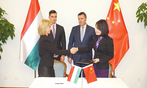 Hungarian Ambassador to China Máté Pesti (left behind) and Hungarian Minister of Innovation and Technology László Palkovics (right behind) witness the signing. Photo: Yin Yeping/GT