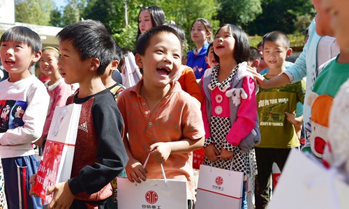 Students of a primary school in Ruyang county of Luoyang city, Central China's Henan Province received school bags donated from an enterprise in the city. Photo: IC