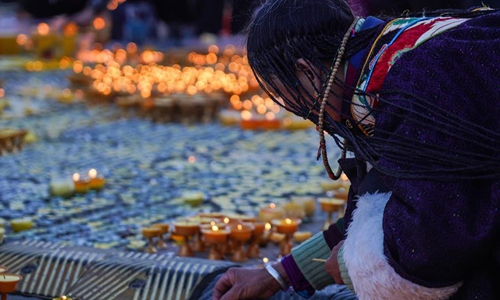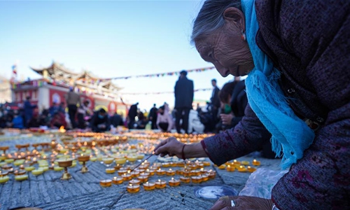 A believer lights butter lamps at Taer Monastery in northwest China's Qinghai Province, Nov. 21, 2019. The Butter Lamp Festival celebrates the beginning of a new year on the Tibetan calendar and is an occasion to pray for happiness and good health by lighting butter lamps. This year's festival falls on Thursday. (Xinhua/Wu Gang)