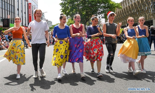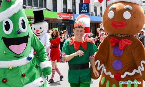 People in costumes participate in the annual Christmas parade in Wellington, New Zealand, Nov. 23, 2019. (Xinhua/Guo Lei)
