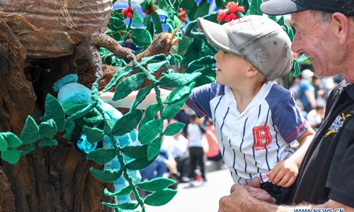 A child interacts with a performer in tree-shaped costume during the annual Christmas parade in Wellington, New Zealand, Nov. 23, 2019. (Xinhua/Guo Lei)