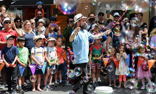 People watch a bubble show during the annual Christmas parade in Wellington, New Zealand, Nov. 23, 2019. (Xinhua/Guo Lei)
