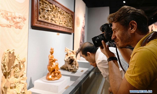 Cristinel Gelu Dadal from Romania takes photos of Quanzhou-style wood carvings during an exhibition on intangible cultural heritages along the ancient Maritime Silk Road in Quanzhou, southeast China's Fujian Province, Nov. 23, 2019. The city of Quanzhou is widely believed to be the starting point of the ancient Maritime Silk Road. (Xinhua/Wei Peiquan)
