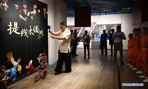 An artist manipulates a marionette in a performance for visitors during an exhibition on intangible cultural heritages along the ancient Maritime Silk Road in Quanzhou, southeast China's Fujian Province, Nov. 23, 2019. The city of Quanzhou is widely believed to be the starting point of the ancient Maritime Silk Road. (Xinhua/Wei Peiquan)