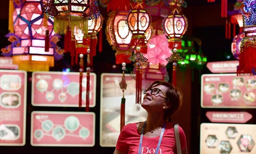 A visitor looks at Quanzhou-style lanterns during an exhibition on intangible cultural heritages along the ancient Maritime Silk Road in Quanzhou, southeast China's Fujian Province, Nov. 23, 2019. The city of Quanzhou is widely believed to be the starting point of the ancient Maritime Silk Road. (Xinhua/Wei Peiquan)