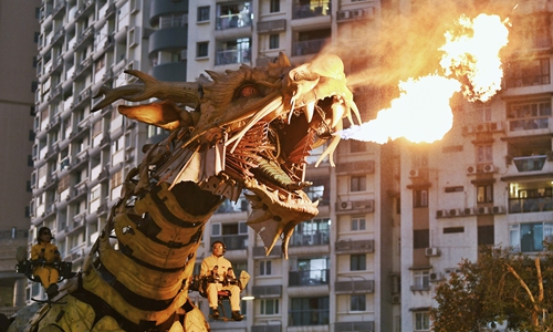 A giant mechanical dragon belches fire during celebrations for the 20th anniversary of Macao Special Administrative Region's return to China on Friday. Photo: VCG