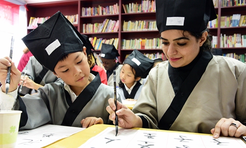 Local and foreign students attend a calligraphy class at Jiangsu University in East China's Jiangsu Province on September 27, 2018. Photo: IC