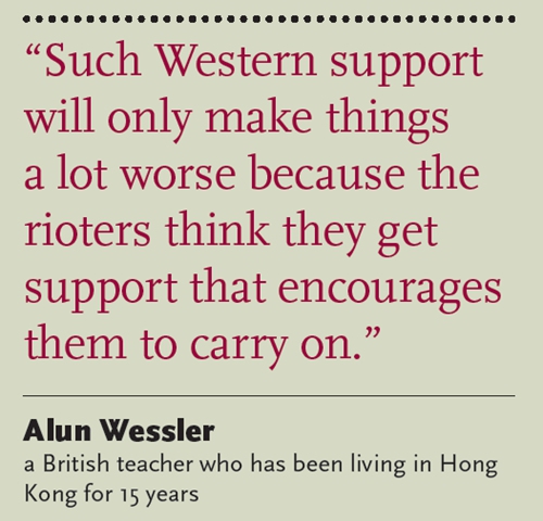 He admitted that the social environment is tense now as some people in his school support the protesters and everybody has to be careful. Different from people in the West who call the rioters "democracy campaigners" and "freedom fighters," Wessler thinks they are "ridiculous."
