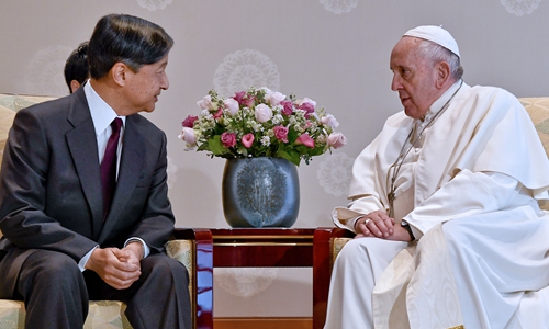 Pope Francis (right) meets with Japan's Emperor Naruhito at the Imperial Palace in Tokyo on Monday. Photo: AFP