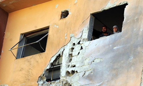 Photo taken on Nov. 20, 2019 shows a damaged residential building in the Qudsaya suburb of Damascus, capital of Syria. The death toll of the Israeli air strikes on Syrian military sites on Wednesday has risen to 23, including two civilians, a war monitor and state media reported. (Photo by Ammar Safarjalani/Xinhua)