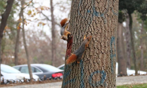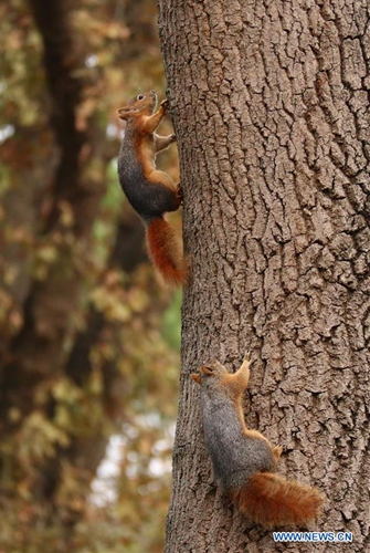 Squirrels are seen at Emirgan Park in Istanbul, Turkey, Nov. 25, 2019. (Xinhua/Xu Suhui)