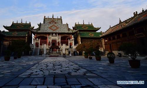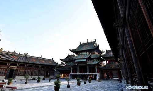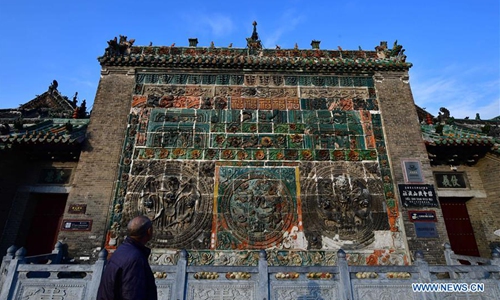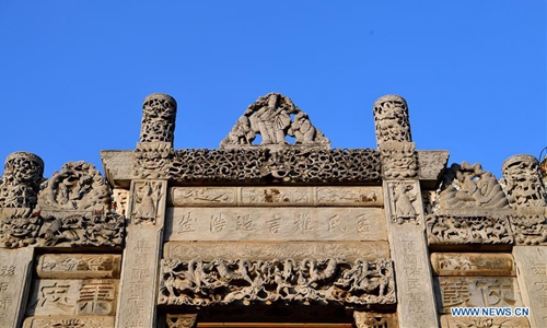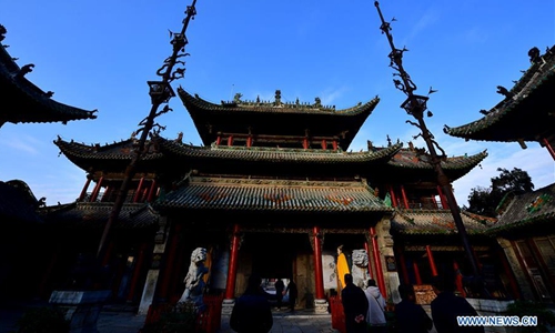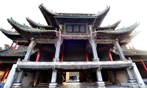 Photo taken on Nov. 25, 2019 shows a building of the Shan-Shaan Guildhall architectural complex in Shedian Town of Sheqi County, central China's Henan Province. The Shan-Shaan Guildhall was co-built by merchants from Shanxi and Shaanxi provinces who then lived in Sheqi County in the Qing Dynasty (1644-1911) in Shedian, a famous commercial township during the ancient Ming and Qing dynasties. (Xinhua/Feng Dapeng)