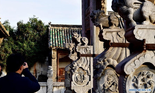 Photo taken on Nov. 25, 2019 shows the stone statues of the Shan-Shaan Guildhall architectural complex in Shedian Town of Sheqi County, central China's Henan Province. The Shan-Shaan Guildhall was co-built by merchants from Shanxi and Shaanxi provinces who then lived in Sheqi County in the Qing Dynasty (1644-1911) in Shedian, a famous commercial township during the ancient Ming and Qing dynasties. (Xinhua/Feng Dapeng)