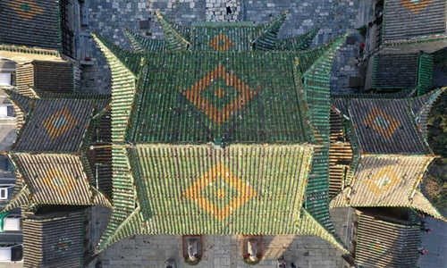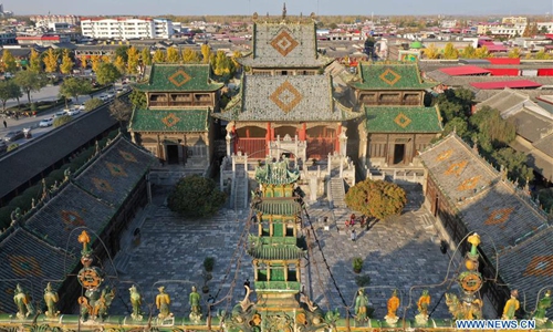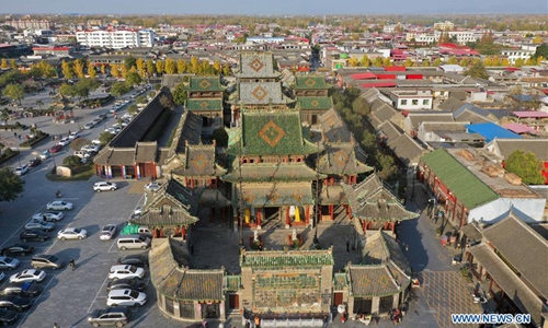 Aerial photo taken on Nov. 25, 2019 shows the Shan-Shaan Guildhall architectural complex in Shedian Town of Sheqi County, central China's Henan Province. The Shan-Shaan Guildhall was co-built by merchants from Shanxi and Shaanxi provinces who then lived in Sheqi County in the Qing Dynasty (1644-1911) in Shedian, a famous commercial township during the ancient Ming and Qing dynasties. (Xinhua/Feng Dapeng)