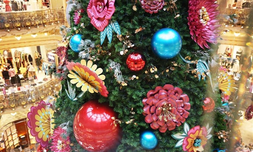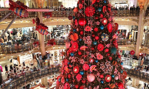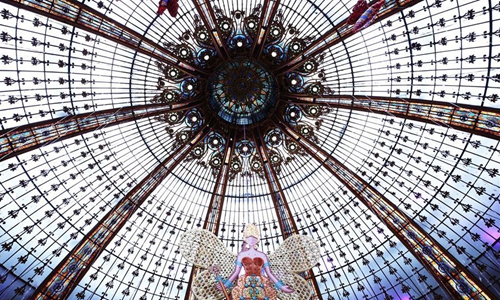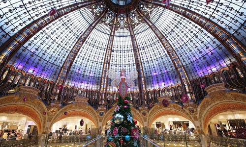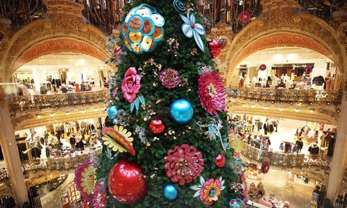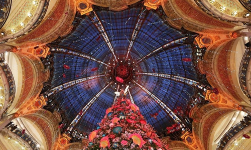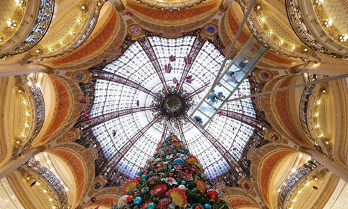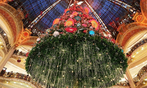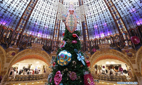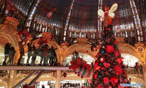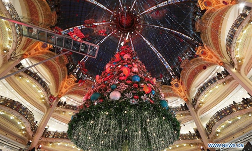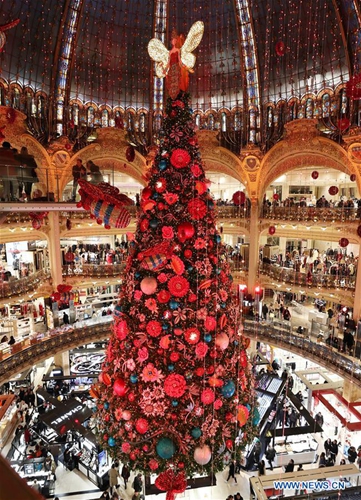 The giant Christmas tree is seen at Galeries Lafayette department store in Paris, France, Nov. 14, 2019. A giant Christmas tree stands at the Galeries Lafayette department store for the festive season. (Xinhua/Gao Jing)