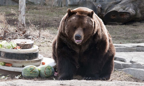 One of a pair of grizzly bears enjoys himself with food on his 20-year-old birthday party at the Brookfield Zoo, west suburb of Chicago, the United States, on March 21, 2015. (Xinhua/He Xianfeng)