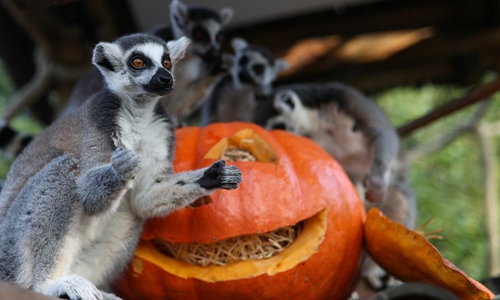 Lemurs play with a pumpkin at Pairi Daiza zoo in Brugelette, Belgium, Oct. 31, 2019. A series of activities were held at the zoo to celebrate the Halloween, attracting numbers of locals and tourists. (Xinhua/Zhang Cheng)
