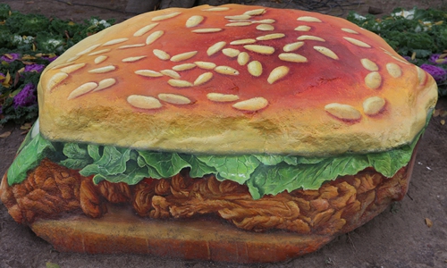 A rock is painted to resemble a hamburger at an exhibition of the Intercontinental Green Expo held in Nantong, East China's Jiangsu Province on Tuesday. The artist uses rocks as his canvases to create works. Photo: VCG